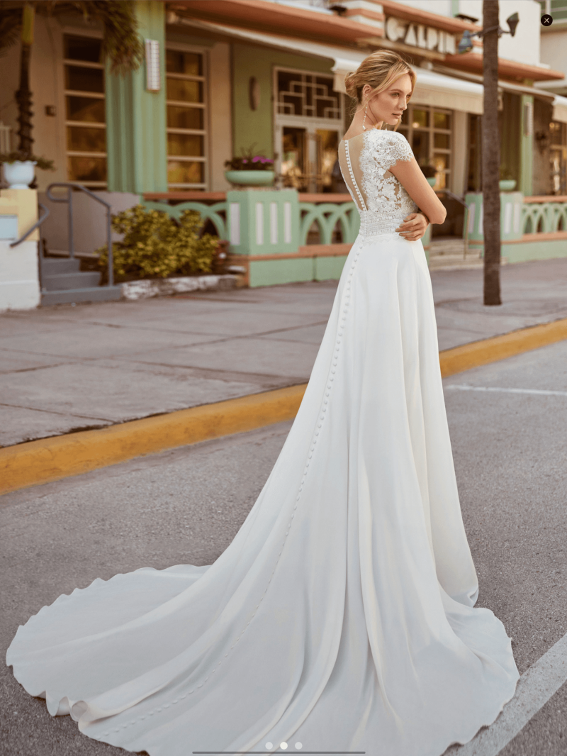Robe de mariée ligne A en crêpe fluide. Dos en V avec pierreries.