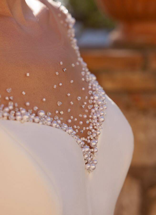 Robe de mariée en crêpe. Décolleté en V profond. La caractéristique la plus frappante de la robe est le dos illusion accentué de perles et de perles ajoutant une touche moderne à ce style avant-gardiste. Une ceinture subtile avec un petit nœud à l'arrière.